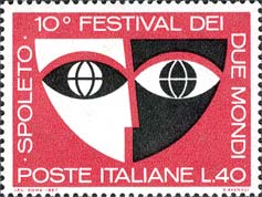 30 giugno 1967 10° Festival dei Due Mondi di Spoleto I francobolli, disegnati da S.Avenati, raffigurano una maschera stilizzata.Furono emessi in due valori (20 L. verde smeraldo e nero e 40 L. rosso carminio e nero) con una tiratura di 20.000.000 di serie. Dal 1967 tutti i francobolli sono ammessi all'affrancatura senza limite di validità. E' l'anno 1958 quando prende il via la prima edizione del Festival dei Due Mondi di Spoleto, un evento nuovo ed unico nell'ideazione, nello spirito, nei criteri, nei personaggi, e che dà voce a tutti gli aspetti dell'espressione artistica. È la prima manifestazione del genere cui si può assistere in Italia; rimarrà ancora per molti anni l'unica. |