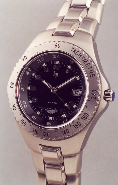 Orologio ad energia solare proposto dalla casa francese Lip. La cassa in acciaio satinato misura 43 mm di diametro (45 mm compresa la corona) per 11 mm di spessore con un peso di 154 grammi.